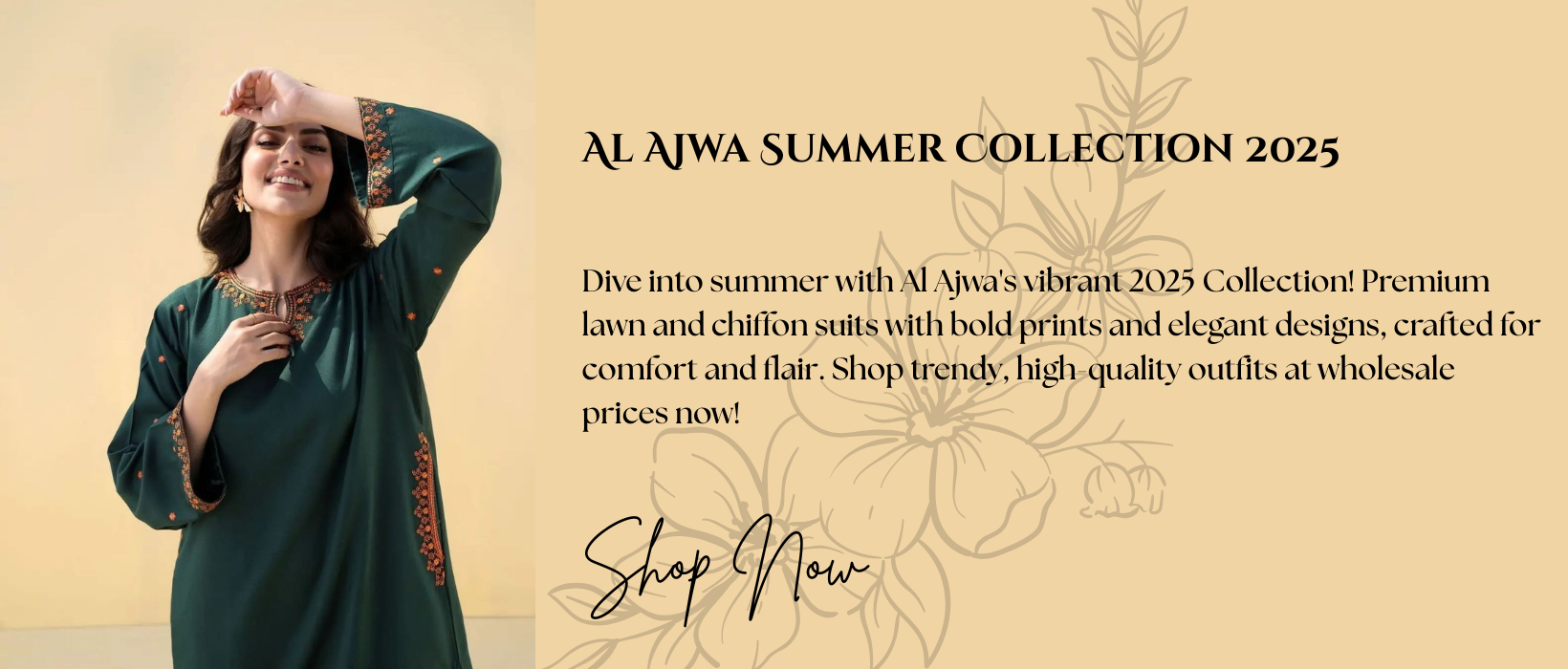 At Al Ajwa, we specialize in providing premium wholesale ladies' branded stitched suits at unbeatable prices. With a commitment to quality and affordability, we bring you the latest fashion trends in stitched lawn, chiffon, and cotton suits. Whether you're a retailer or a fashion enthusiast, we deliver stylish and high-quality outfits all over Pakistan at the lowest wholesale rates. Shop with confidence and elevate your wardrobe with Al Ajwa!